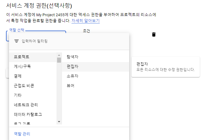 계정 권한은 다음과 같이 준다. '프로젝트-편집자'를 택했다. 사실 이 부분이 효과가 있는지는 모르겠는데, 혹시 몰라서 일단 줬다. 읽기 권한만 필요하면 뷰어만 줘도 될 것이다. (요 부분은 정확히 아시는분이 있으면 댓글 부탁드리겠습니다..)