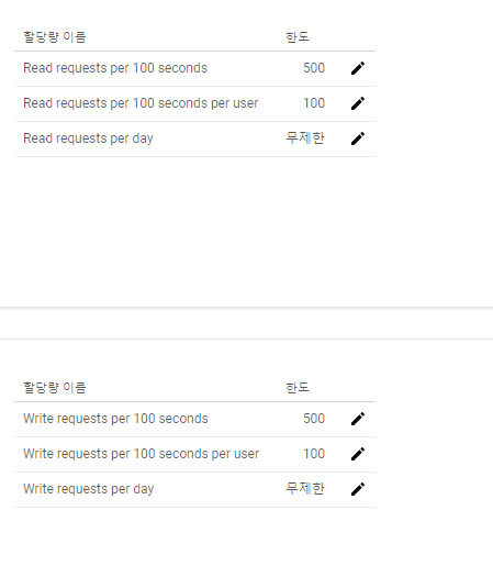구글 Sheet API 무료 이용 한도이다. 기본적으로는 무제한이지만, 개인당 매 100초당 100회, 즉 초당 1개씩꼴의 요청만 보낼 수 있다. 즉, loop문 속에서 셀 하나씩 가져오는 식으로 코딩하면 바로 한도에 걸린다. 따라서, 다음과 같은 식으로 코딩해야 한다.