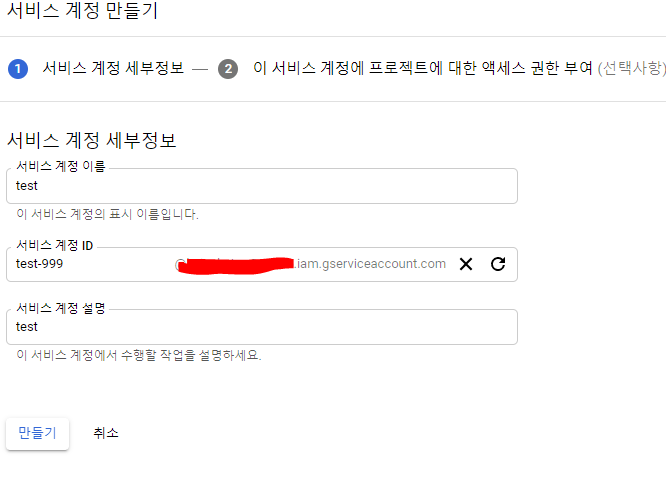 원하는 대로 서비스 계정 이름과 설명을 넣는다. ID는 자동으로 만들어진다.