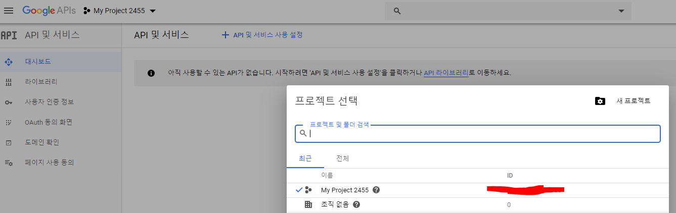나는 현재 프로젝트가 하나 있기에, 지금 보이는 화면과 조금 다를텐데, 맨 위의 google APIs 옆에 아마 '프로젝트 없음'으로 뜰 것이다. 그걸 누르면 사진과 같이 프로젝트 선택이 뜨는데, 나는 만들어 뒀던 게 있어서 기존 프로젝트가 뜨지만, 아마 아무 것도 없을 것이다. 이제 새 프로젝트를 눌러서 프로젝트를 만들면 된다. 이 이후엔 읽어보고 특별한 사항이 없다 싶으면 예스맨 하면 된다.