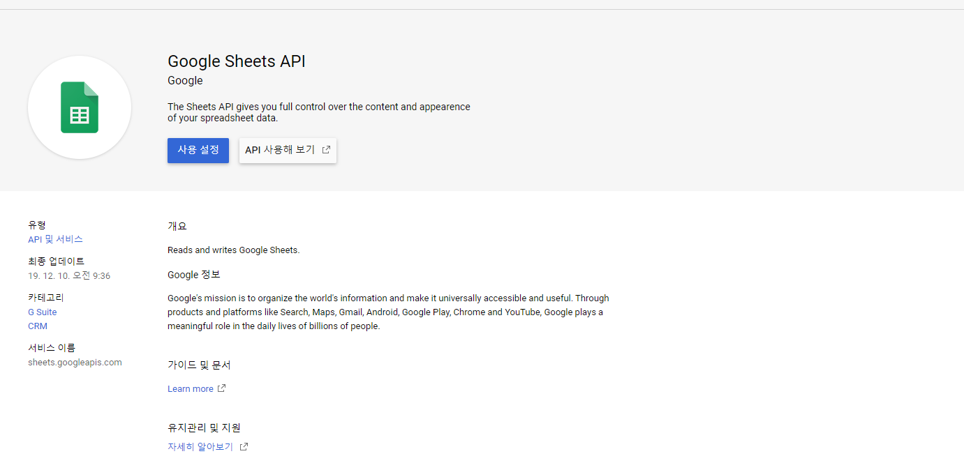 이제 프로젝트가 만들어졌고, 구글 스프레드시트 API를 사용하도록 설정해야 한다. 하라는 대로 API 및 서비스 사용 설정을 누르자. 그러면 크롬 웹스토어랑 비슷한 화면이 뜰 텐데 검색창에 sheet만 쳐도 아래와 같은 API가 나올 것이다.